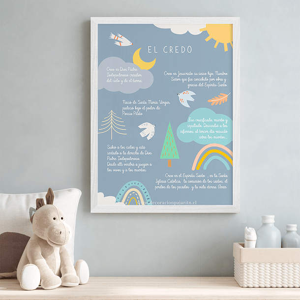Cuadro ilustrado con lindo paisaje y oración religiosa de El Credo. Ideal para regalo de Bautizo o Primera Comunión. Diseño único y original de Decoración Pajarito, hecho en Chile. Aprovecha su maravillosa envoltura para regalo!